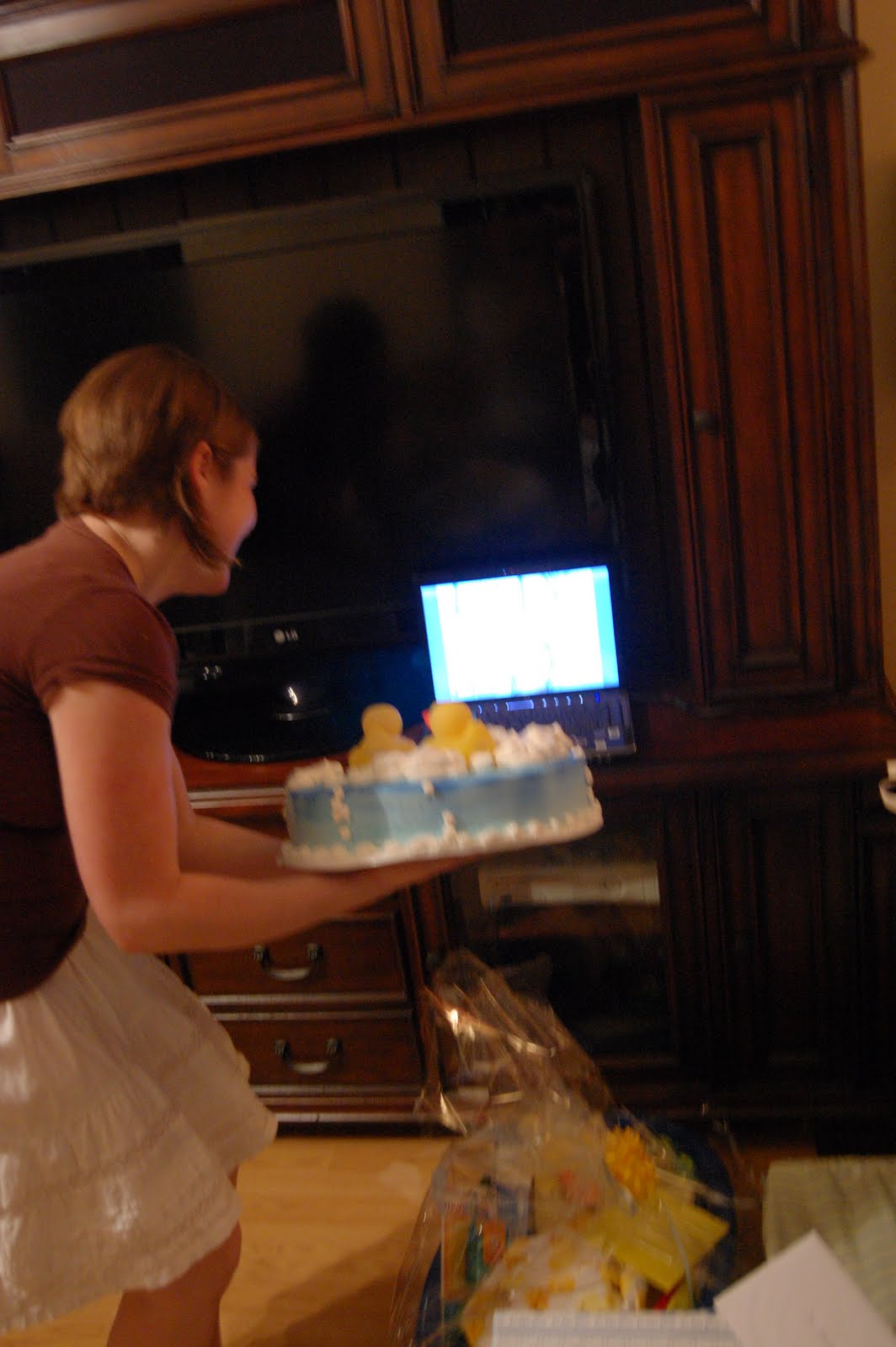 My mother and grandmother could not make it since they live about 6 hours away, so my friend Brandi was nice enough to set up skype so they could watch the entire shower, as if they were there! In the picture she is showing them the cake!