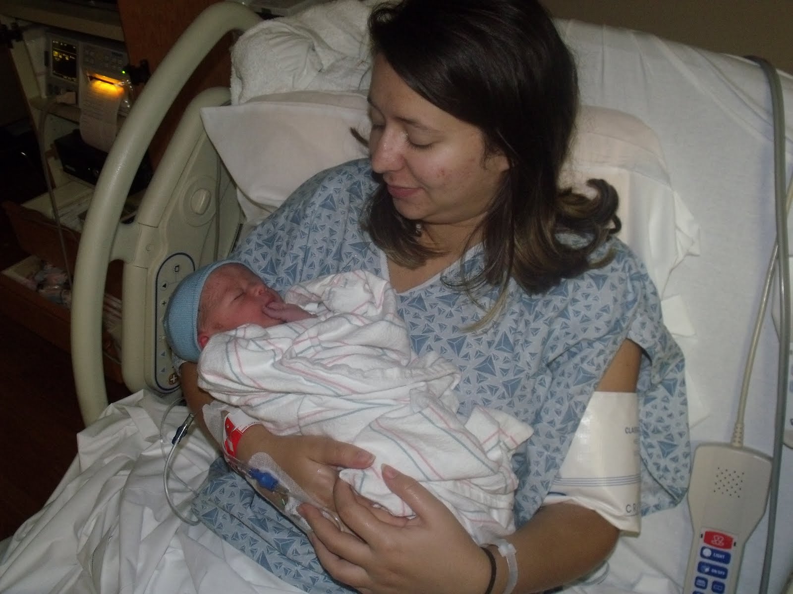 Around this time my mom had arrived from her 6 hour drive from Florida. She kept us company for awhile. The nurse kept checking me and I kept asking what I should be feeling as far as when I should know if it was time to push or not. She assured me that I would definitely know! A little while later my in-law’s arrived and came to visit for a few minutes before they went to wait with my mom in the waiting room. Finally, the nurse checked told me it was time, I was at 10 cm. and ready to push! I was really nervous about it, and so ready to meet Adam! The nurse explained how everything was going to go and how to push. Every time I had a contraction she told me I would take a deep breathe, hold it and push while she counted to 10.