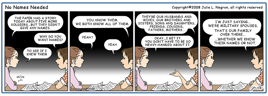1. I just love Julie (and Jenny!) and think it's great you spoke with her. Her cartoons were an inspiration to me when I first became a military spouse and went through our first deployment. I found myself nodding along with her comics as I found myself in similar situations as Jenny. Great, great post!