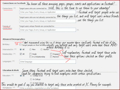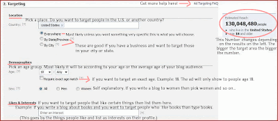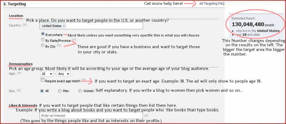 2. Targeting. Targeting can be very specific it just depends on what you are advertising and who your audience is. Look at example 1# (above) to see what I listed as my targeted audience.