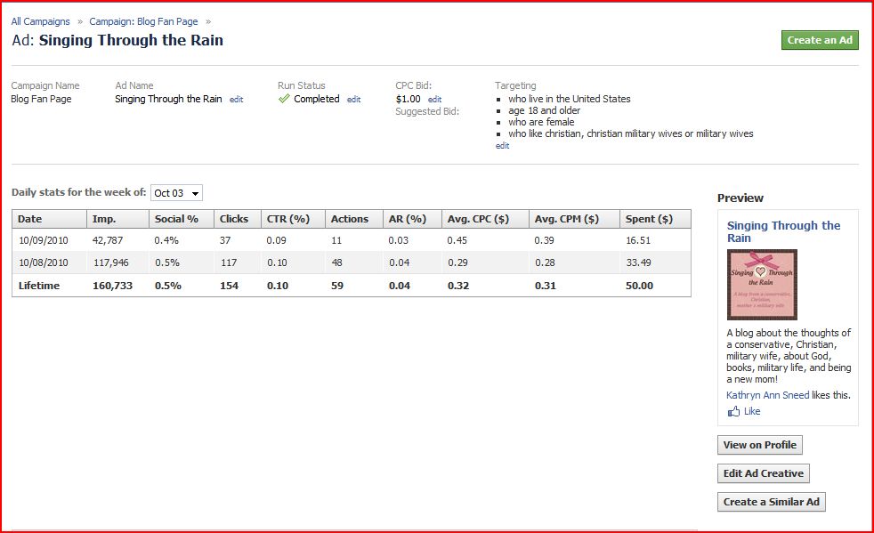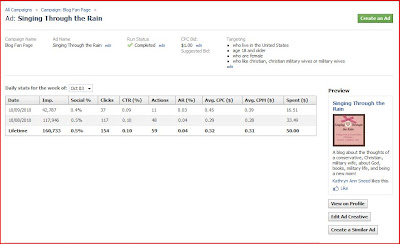 For several months now facebook has been sending me a free $50. coupon to use on my fan pages. I wanted to try it out, but I was hesitant because I did not want to get charged over the free $50. off and I was not sure how it all worked. After much debating over it I decided to give it a try! I made an ad on facebook, I used my $50. off coupon code, and I waited for the results. I made the ad link to go to my blog fan page on facebook. I set the ad for one 24 hour period and set the ad so that it did not charge me over the $50. off. Here is what my ad looked like: