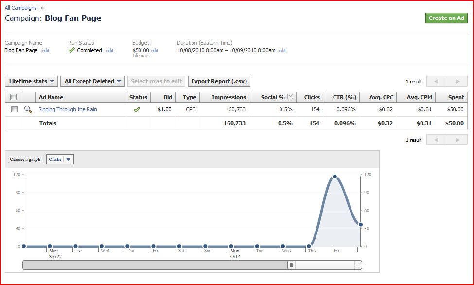 I really liked the results. Within 24 hours I received 154 clicks and 75 new fans to my fan page. Here is what the results looked like (click to enlarge):