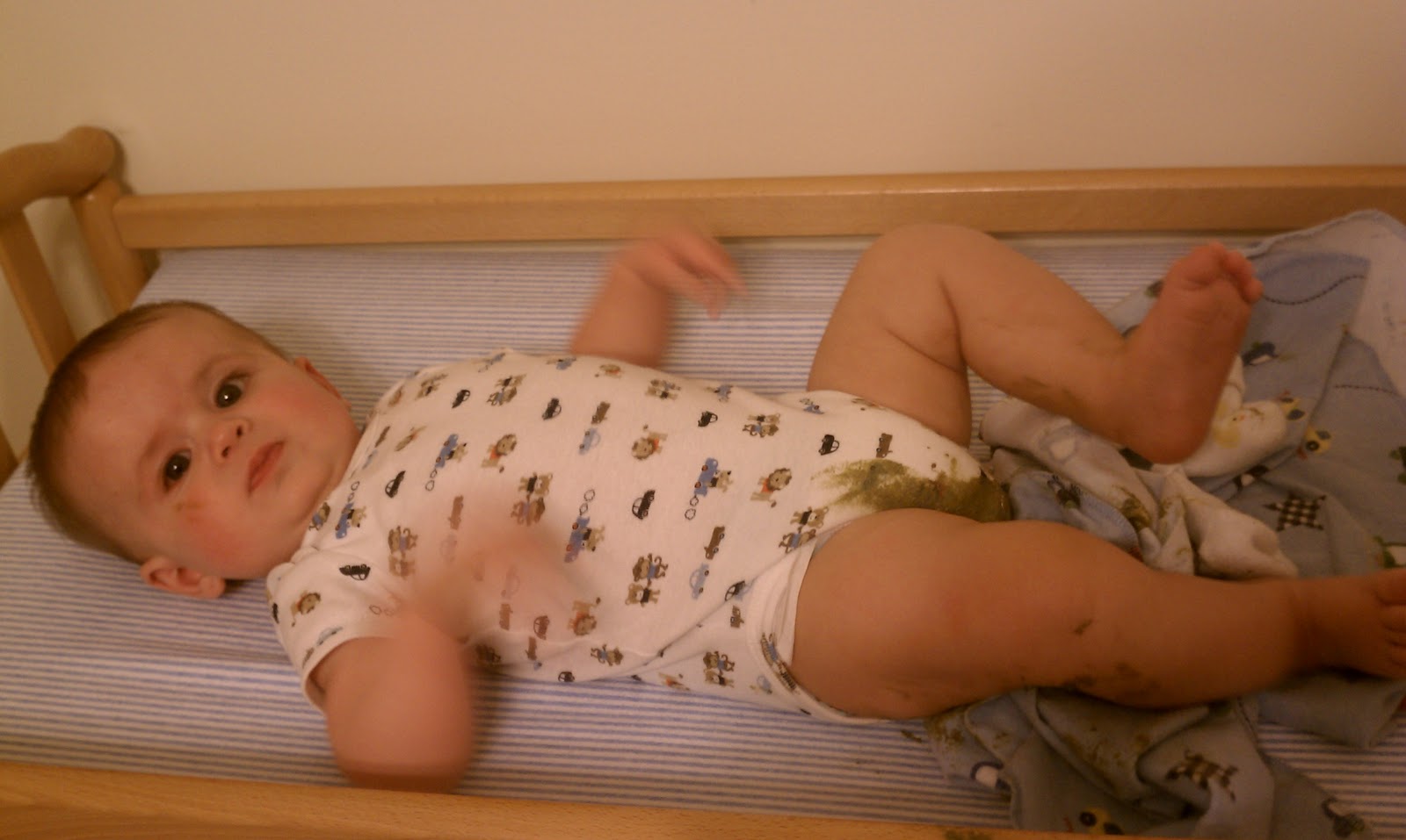 By this time, he has gotten it everywhere, yes even on his face. Ugh. In the meantime I am standing there trying to figure out what to do. Adam has it everywhere and meanwhile I am still standing there with it all over my pants as well. My husband was working at the time and I had no one to help me. I tore off my pants and rolled it into a ball, and worked on taking care of Adam. Took care of his clothes and promptly got myself and him into the tub. Sadly, he hates baths so he screamed the entire time.