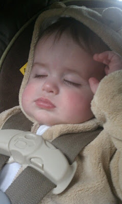 The day after Christmas we went down to Florida for Christmas with my family. It was a 6 hour trip which was the longest Adam had ever been. I was a little worried about it, but it wasn’t too bad! A friend of ours let us borrow a portable DVD player for the car so we set that up, and when he got upset we put on Baby Einstein. He loved it! This picture is how he fell asleep on the way there.