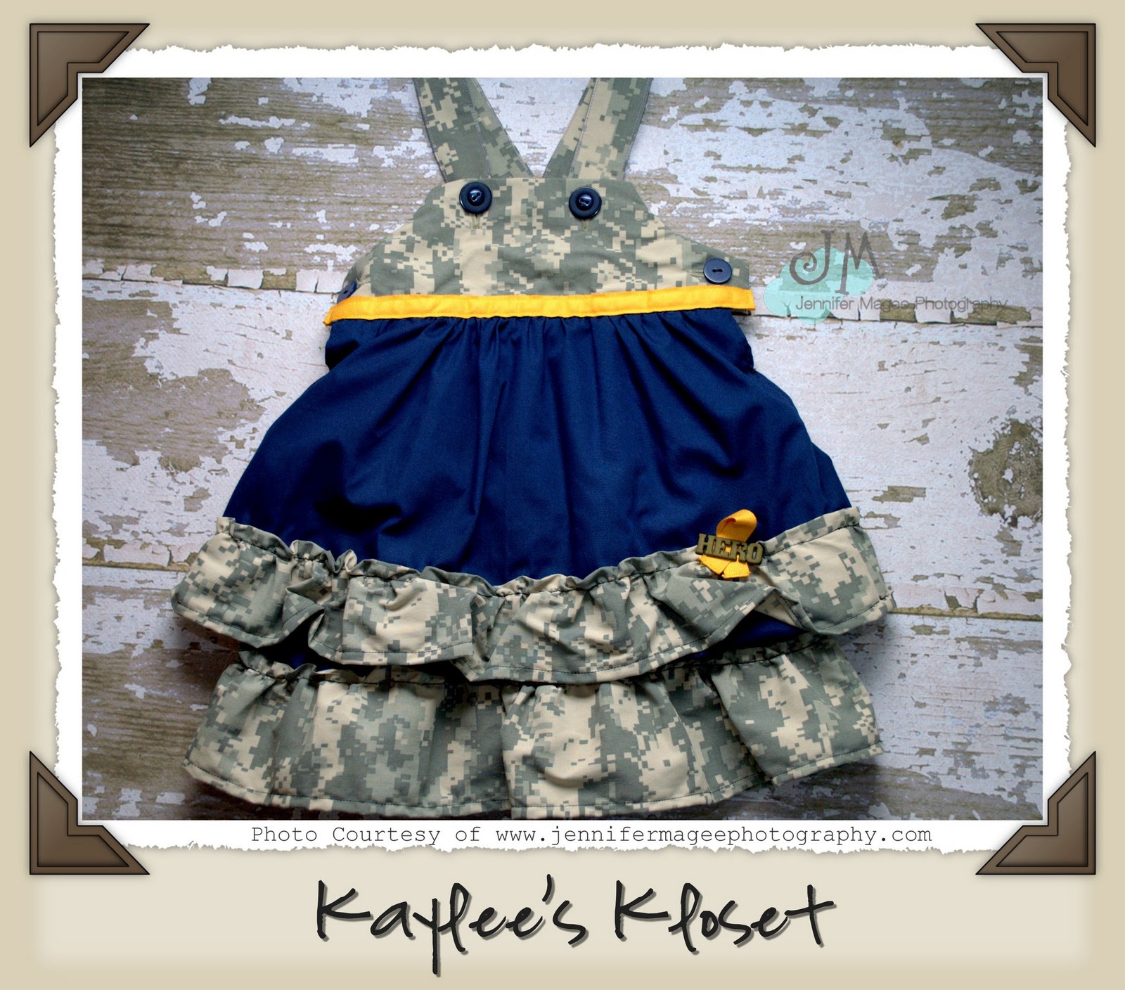 From Kaylee’s Kloset: “Deployment can bring a lot of things… one thing I was not going to let it bring, was boredom! So to fill my extra time (between going back to school, giving horse back riding lessons, and raising a 1 year old boy) I began making a quilt for the new queen bed I was going to buy before my soldiers return! When I had completed the quilt, and was settled into our new apartment waiting for his return that summer, I found myself itching to continue sewing! I had a lot of scrap fabric, and Wal-Mart had just put their ACU fabric on clearance (crappy quality material may I add, I do not use that fabric for my products!). I decided to make a little summer dress for another couple in my husband’s unit due shortly after they returned!